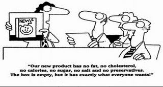 «O nosso novo produto não tem gorduras, colesterol, calorias, açúcar, sal ou conservantes. A caixa está vazia, mas é exactamente o que toda a gente quer...!»