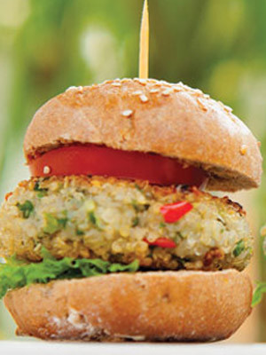 Pique o cebolinho, o piri-piri e as ervas. Misture a pimenta e as ervas, envolvendo-as com o azeite. Acrescente a quinoa e a farinha e acerte o sal. Molde os hambúrgueres com as mãos em formato de discos. Numa frigideira aquecida antiaderente doure os hambúrgueres de ambos os lados.
