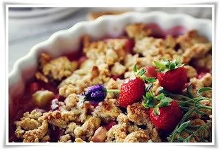{2 maçãs | 2 pêssegos maduros | 10 morangos maduros | 3 colheres de açúcar mascavo ou adoçante | 150g de muesli biológico | 1 chávena de leite magro | uma colher de sopa de farinha integral | 1 colher de chá de manteiga sem sal magra.