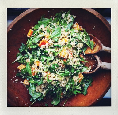 Salada de batata doce assada, quinoa e rúcula