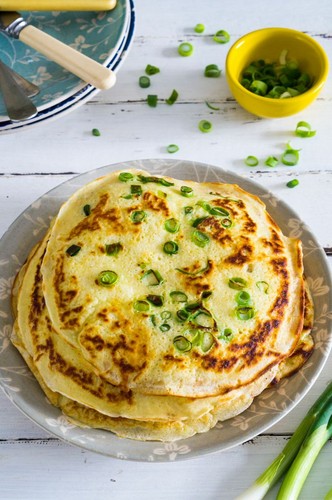 Bata os ovos, o leite e a manteiga em uma tigela. Peneire a farinha, o fermento e o sal em outra tigela. Aos poucos, adicione a mistura de ovos à farinha e mexa até ficar homogeneo. Deixe a mistura no frigorífico durante uma hora. Aqueça uma frigideira anti-aderente em fogo médio até ficar bem quente. Adicionar cerca de 3 colheres de sopa de massa para fazer uma camada fina. Polvilhe com cebolinho. Cozinhe por dois minutos até que as bolhas comecem a aparecer, vire e cozinhe por mais um minuto até dourar. Mantenha quente enquanto cozinha os restantes panquecas.