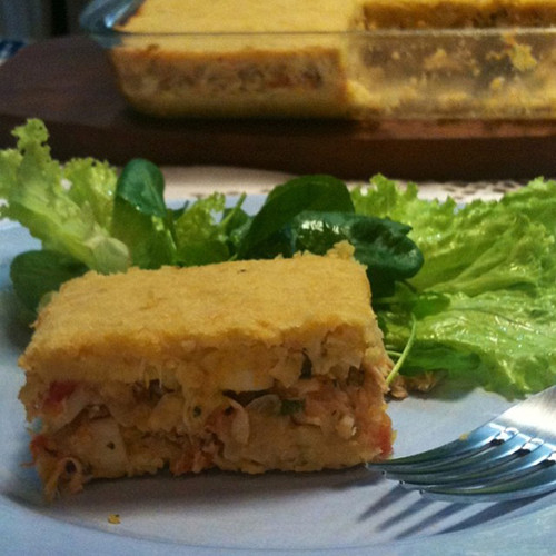 Recheie a massa e cubra com o restante dela, pincele com azeite e leve ao forno preaquecido por 30 minutos ou até dourar.
