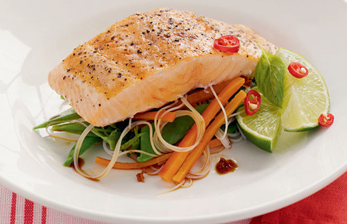 Numa frigideira antiaderente, adicione a cenoura, a ervilha, o nabo, o molho de soja e o gengibre. Mexa durante 5 minutos, desligue o lume, tape e reserve. Num grelhador bem quente, grelhe o peixe dos dois lados. Coloque os legumes num prato e coloque o peixe grelhado por cima. Decore com manjericão, pimenta e sirva com limão.